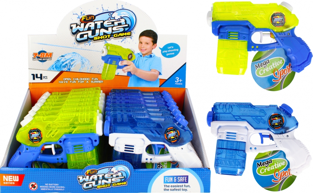 Popis produktu: Vodní pistole je skvělou formou letní zábavy pro celou rodinu. Se spolehlivou pistolí MEGA CREATIVE Pistol můžete bojovat ve vodě nebo ji použít ve vlhkém pondělí a předvést někomu mokrý trik. Pistole má odnímatelnou nádrž na vodu. Pistole vystřelí po stisknutí spouště. Hračka vyrobená z plastu. Dodává se ve dvou barevných provedeních: modro-bílá a zeleno-bílá. Výrobek je určen pro děti ve věku: 3. Baleno v displeji A&39; 14 ks Rozměry balení - délka displeje x výška x hloubka. cm: 36x13x25, hmotnost balíku - zobrazení kg. 1,24 kg. Rozměry výrobku délka x výška x hloubka cm 17x12x4, hmotnost výrobku kg. 0,07 kg. Baleno v displeji A&39;14. V hromadném kartonu po 252 kusech.