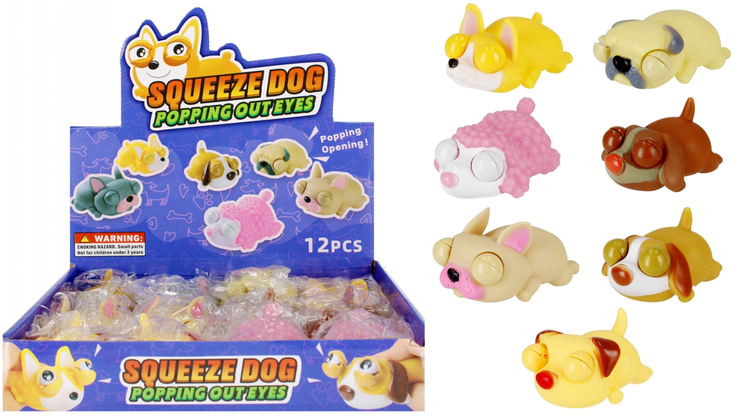 Popis produktu: lze použít jako antistresovou hračku. Skvělé na hraní i jako ruční posilovač. Dobrý nápad na uvolnění stresu a zábavu v jednom. Antistresový míček vám pomůže nejen při učení, jak se vyrovnat se stresem, ale bude skvělý i pro zábavu a jako posilovač rukou. Hračka ve tvaru psa měří pouhých 9 cm a má tolik možností, že se po stisknutí objeví vypoulené oči. Rozměry/hmotnost/baterie: rozměry produktu [cm]: 9 cm, rozměry balení DISPLAY (délka x výška x hloubka) [cm]: 26x5x24, hmotnost produktu bez obalu [kg]: 0,03 kg, hmotnost produktu v balení DISPLAY [kg] : 0,51 kg, nevyžaduje baterie. Hračka je určena pro děti od 3 let. Baleno v displeji po 12 kusech.