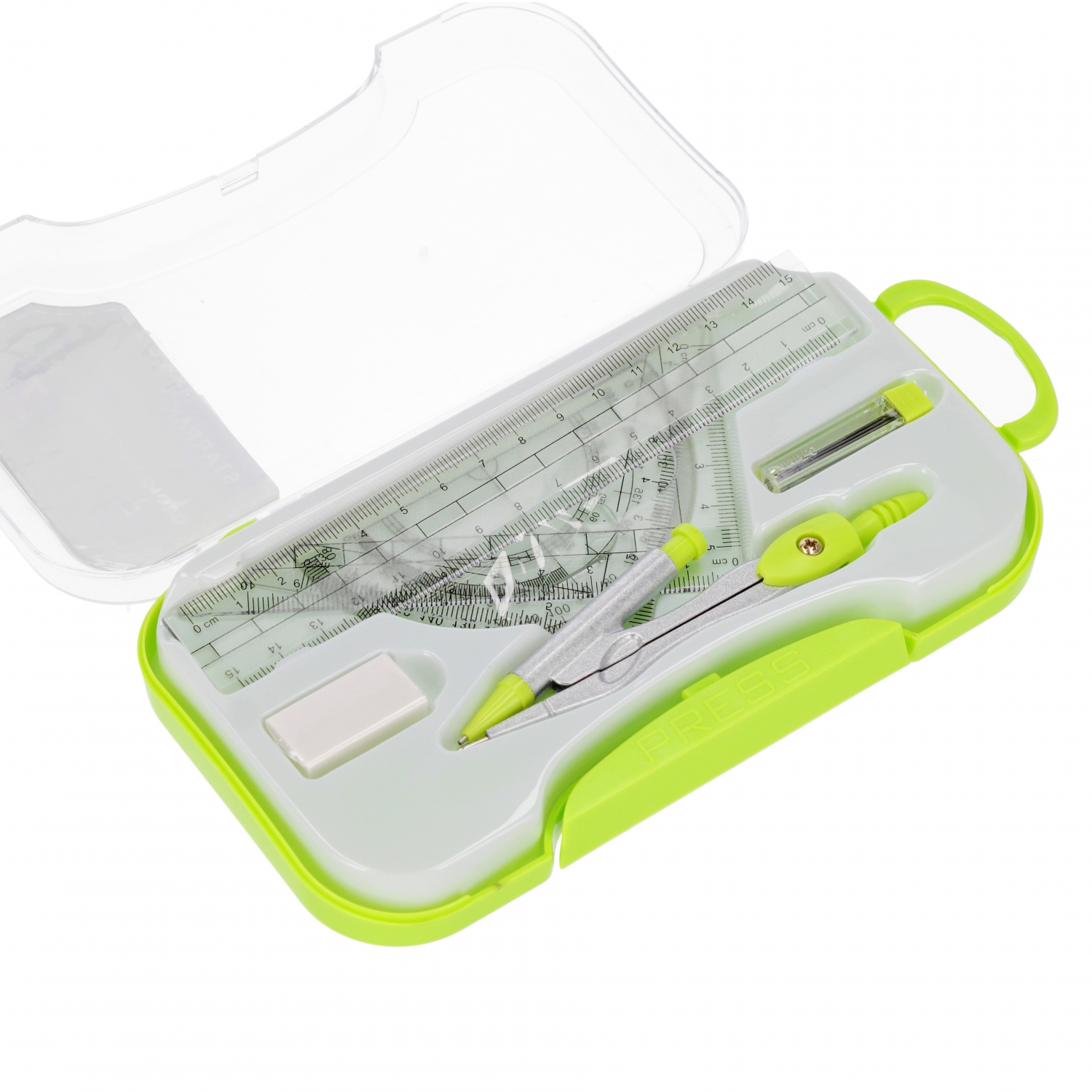 Výhody produktu: Geometrická sada z kolekce Starpak věnované škole. Geometrická sada se skládá z 1x kružítka, 1x nádobky s tuhými kružítky, 1x gumy, 1x pravítka 15 cm, 2x úhelníku a 1x úhloměru. Celé je zabaleno v zeleném plastovém pouzdře. Sada je vyrobena z vysoce kvalitních materiálů. Nezbytná sada pro hodiny matematiky. Podívejte se také na další produkty Starpak určené do školy. Sada určená pro děti ve věku: 3 let. Rozměry produktu v balení výška x šířka cm 20x10m. Hmotnost výrobku v obalu kg. 0,031 kg. Vnitřní balení 12 ks. Karton 96 ks.